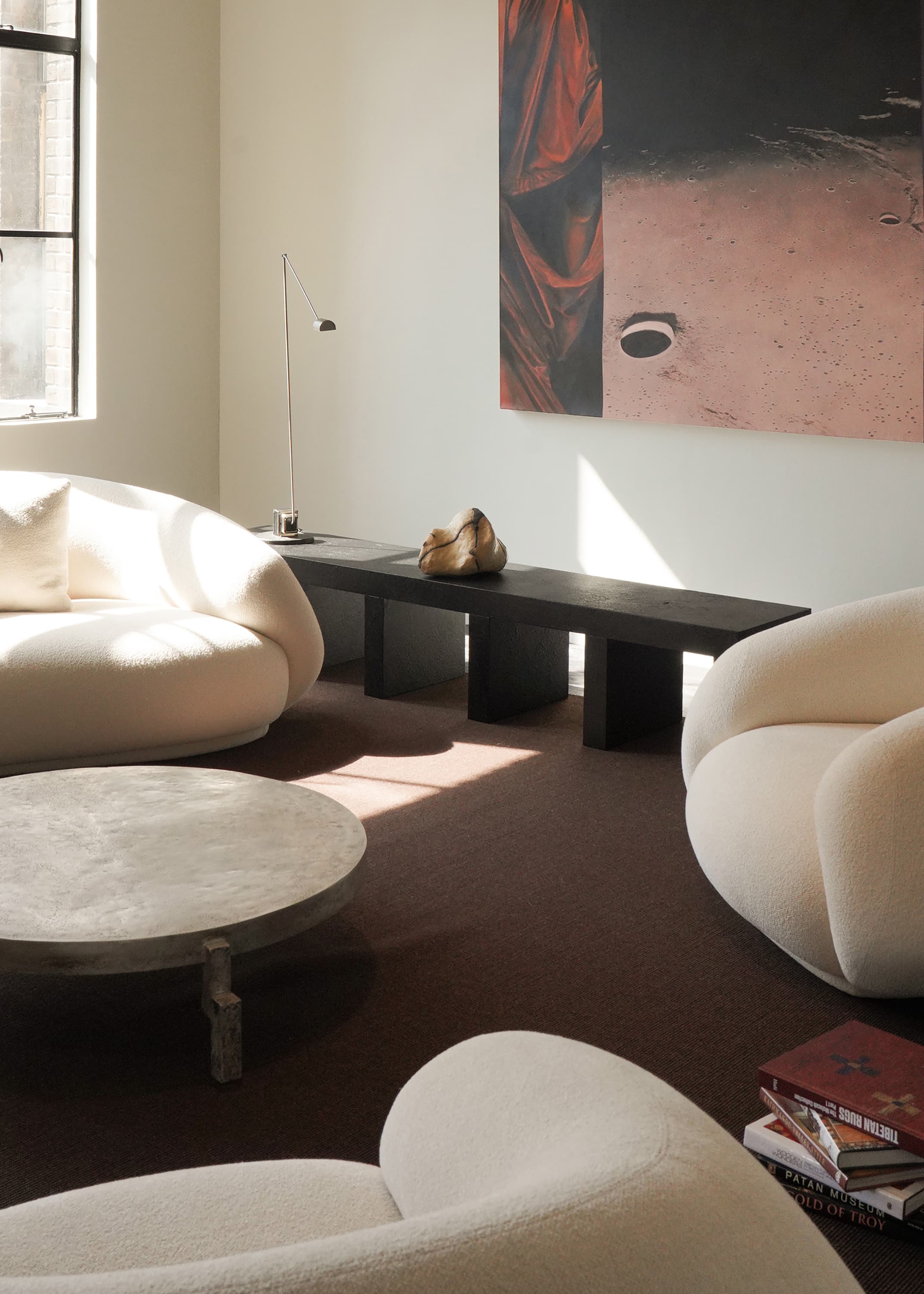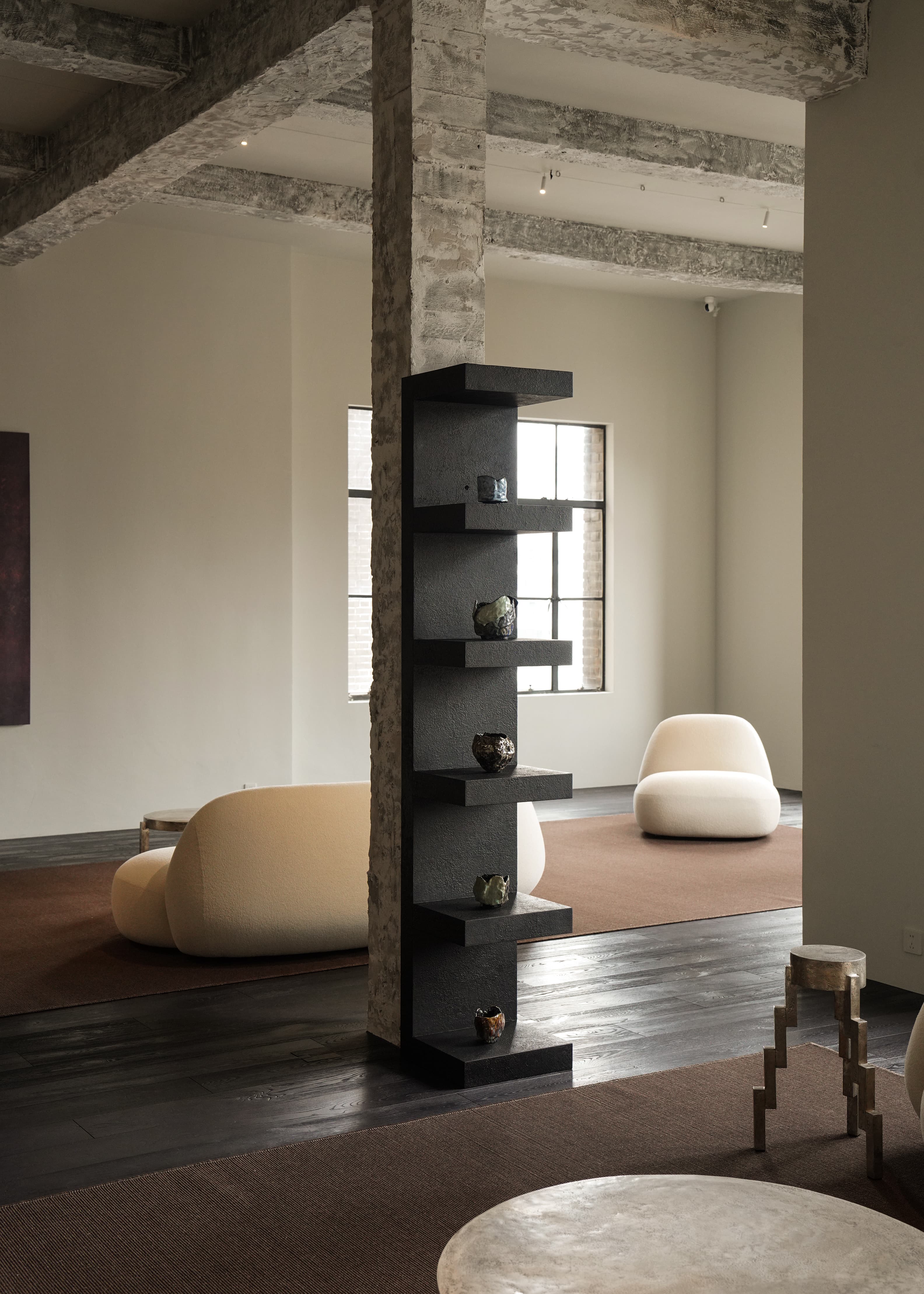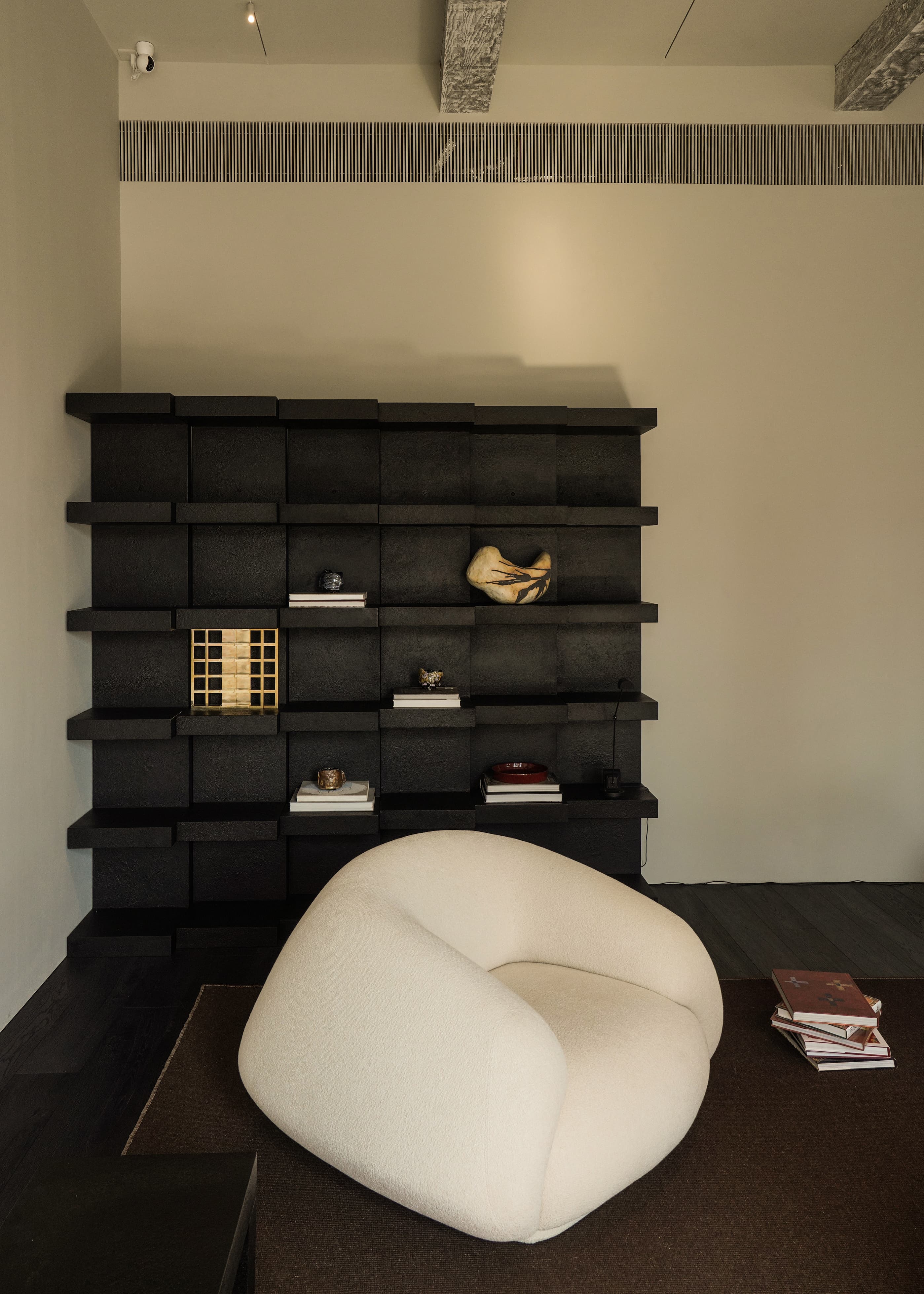 Constructed in steel with a honeycomb aluminum core and finished in a stone-textured coating, a single 2.2-meter module functions as a standing cabinet or bookshelf. When placed horizontally, it becomes a coffee table or bench. Multiple modules can be combined to form bookcases, display systems, or spatial partitions, where minimalism and ornamentation coexist.